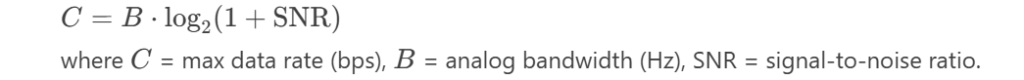 Bandwidth refers to the maximum data transfer rate a channel can sustain, measured in bits per second (bps).- Channel Capacity (Shannon-Hartley Theorem):